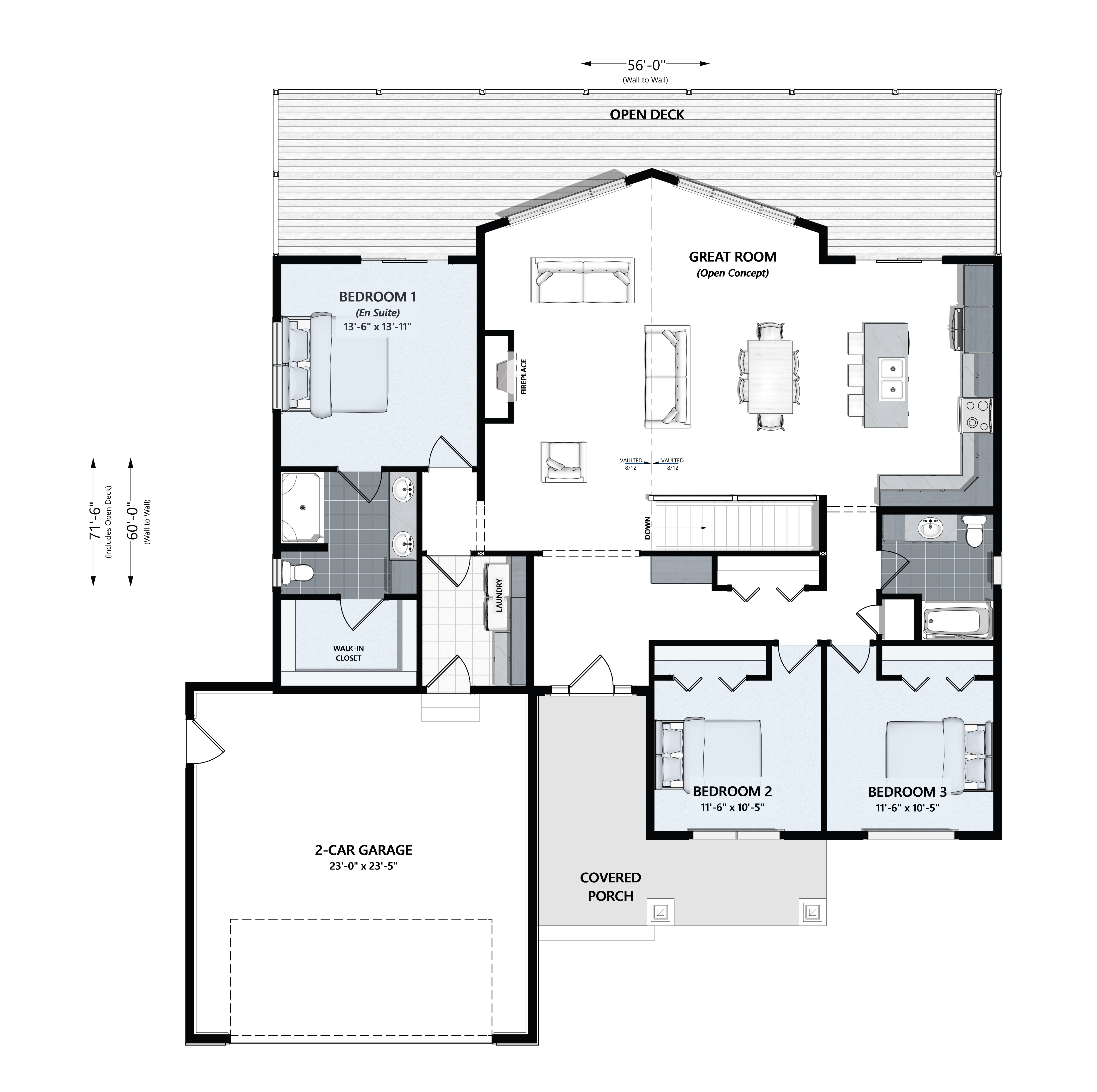 Recently redesigned, the Brule II is a modern take on one of our most-loved layouts. This 3-bedroom, 2-bath home features a split-bedroom design, giving the owner's suite added privacy along with a walk-in closet and ensuite bath.