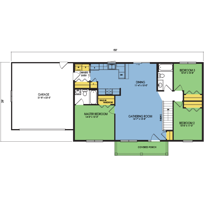 A part of our Dream Series, the Hemlock floor plan features 3 bedrooms, 2 bathrooms, a 2 car garage, a footprint of 68x28 feet, and 1288 total square feet of living space. Floor Plan #DR133
