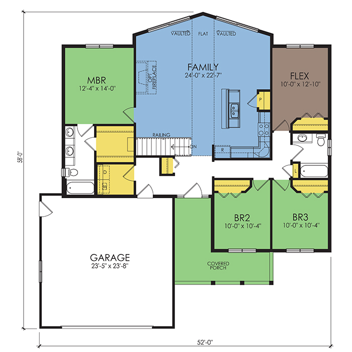 A part of our Wausau Originals, the Brule floor plan features 3 bedrooms and 2 bathrooms with a foot print of 52x58 feet and 1657 total square feet of living space. Floor Plan #WO622