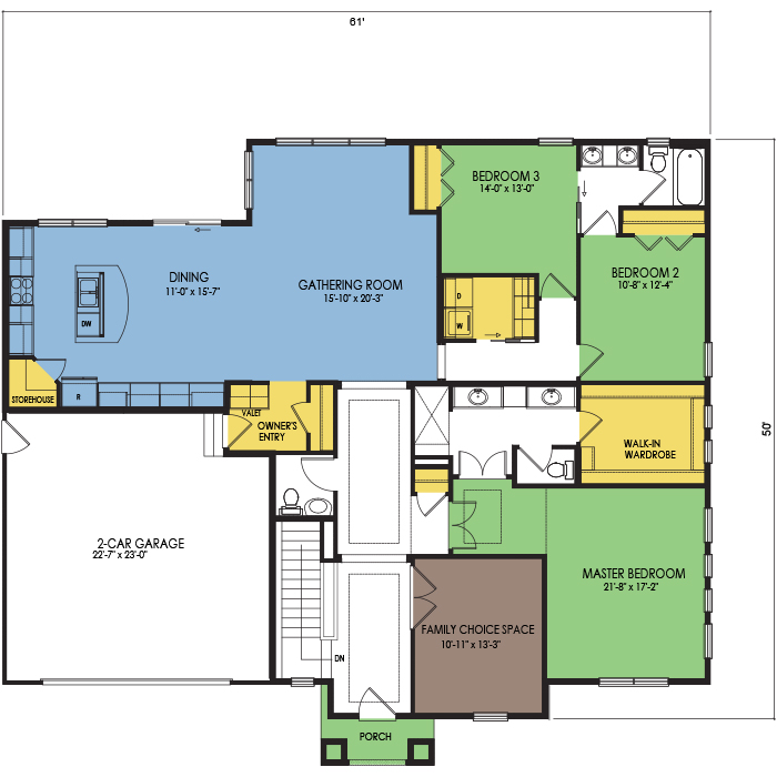 A part of our Resort Series, the Palisade floor plan features 3 bedrooms and 2.5 bathrooms with a foot print of 61x50 feet and 2253 total square feet of living space. Floor Plan #RN152
