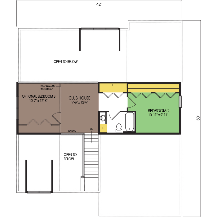 A part of our Vacation Series, the Snowbank floor plan features 2 bedrooms and 2.5 bathrooms with a foot print of 42x50 feet and 2021 total square feet of living space. Floor Plan #VL343